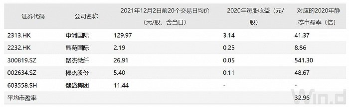 泰慕士自己选取的可对标上市公司包括港股上市的申洲国际(2313.HK)、晶苑国际(2232.HK)和A股上市的聚杰微纤(300819.SZ)、棒杰股份(002634.SZ)以及健盛集团(603558.SH)。泰慕士表示,聚杰微纤2020年静态市盈率显著异常,健盛集团2020年归母净利润为负数,剔除两家后计算得到的行业平均市盈率为32.96倍。这一结果高于泰慕士目前的招股定价。