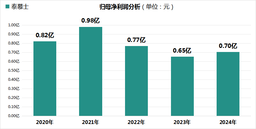 公司 2023 年归母净利润为 6519.14 万元,2024 年归母净利润同比增长 7.96%。营业总收入方面,2023 年为 7.99 亿元,2024 年达到 9.08 亿元,同比增长 13.61%。扣非净利润 2023 年为 5099.16 万元,2024 年为 5830.79 万元,同比增长 14.35%。虽然2024年公司归母净利润增长,但相较2021、2020等年份,仍然有一定差距。