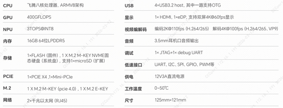 飞腾派PRO:一款面向行业工程师、学生和爱好者的开源硬件。主板搭载飞腾自主研发的八核处理器,兼容Arm V8指令集。处理器内集成高性能GPU和VPU,支持H.264/H.265 4K@100fps解码与2K@110fps编码,集成3TOPS算力NPU,可满足轻量级AI应用。