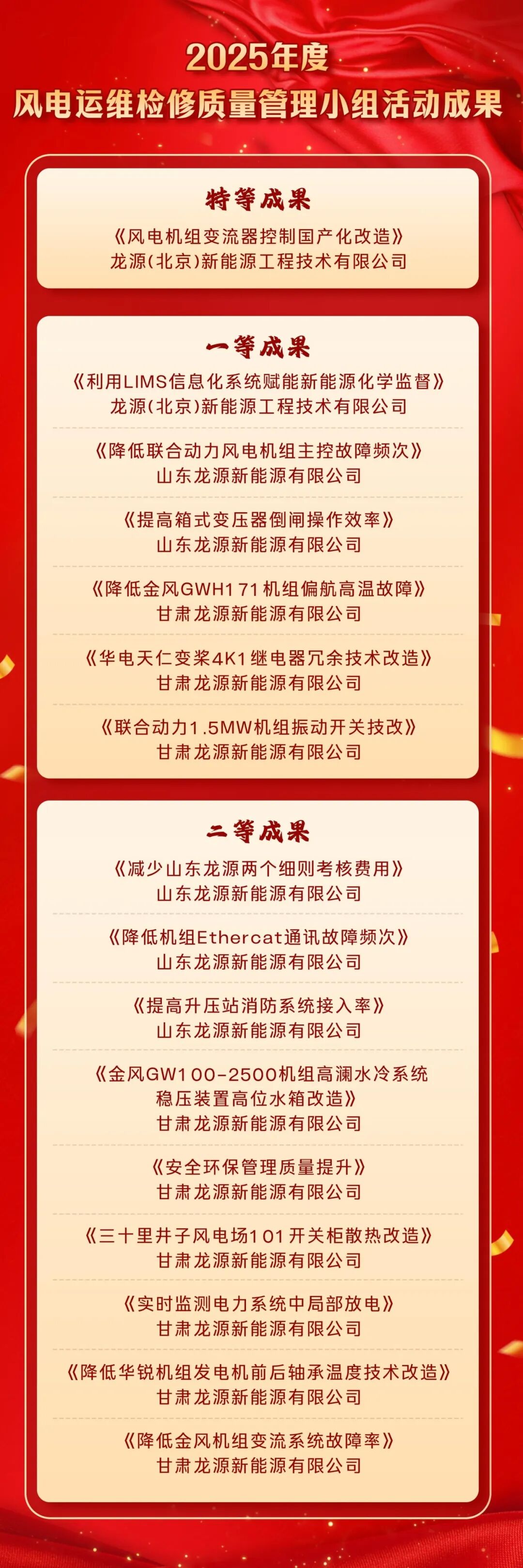 近日,中国电力技术市场协会公布《2025年度风电运维检修质量管理小组活动成果名单》,龙源电力凭借深厚的技术积累与创新实践经验获评特等成果1项、一等成果6项、二等成果9项。
