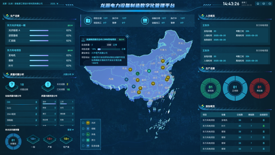 设计院以数字化改革为牵引,基于自主研发的设备制造数字化管理平台,建成覆盖“驻厂、抽检、云监造”三位一体的“设备供应链质量闭环监督体系”,实现监造数据实时采集、质量问题一屏统览、供应商绩效一键画像、风险隐患事前预警,推动质量管理从“经验驱动”向“数据驱动”跃迁。该平台围绕风电塔筒、光伏支架、变配电设备等关键设备,构建覆盖抽检、驻场监督及质量问题闭环管理的数字化监督体系,实现从项目立项到报告归档的全过程线上管理。
