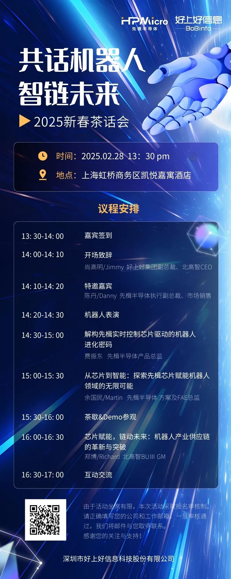 2月28日,好上好信息(股票简称:好上好,股票代码:001298)将携手先楫半导体,举办2025新春茶话会·上海站。本次活动以“共话机器人智链未来”为主题,将汇聚行业众多精英伙伴,深入探讨芯片赋能下的机器人技术革前沿路径,挖掘智能生态的无限潜力,共同推动产业链协同创新。