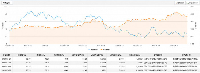 德明利7月27日大宗交易成交186.96万股,成交额1.32亿元,占当日总成交额的45.41%,成交价70.79元,较市场收盘价73.29元折价3.41%。