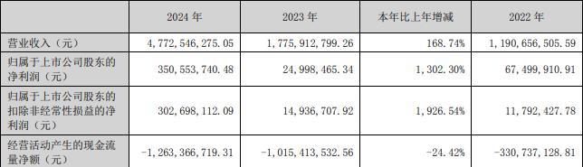 据公司2024年年报,报告期内,公司实现营业收入47.73亿元,同比增长168.74%;归属于上市公司股东的净利润3.51亿元,同比增长1302.30%;归属于上市公司股东的扣非净利润为3.03亿元,同比增长1926.54%;经营活动产生的现金流量净额为-12.63亿元,2023年为-10.15亿元,2022年为-3.31亿元。