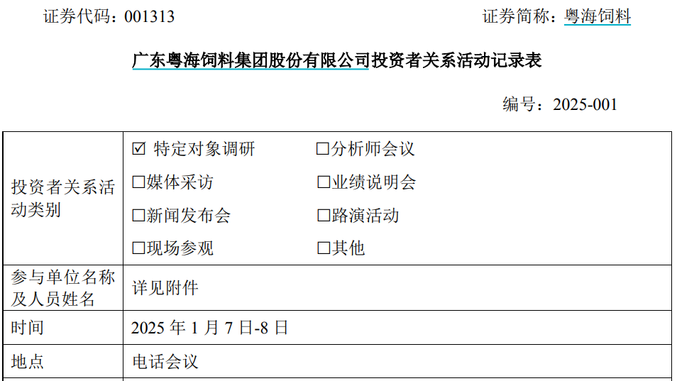 2025年1月8日,上市公司粤海饲料(001313.SZ)发布了《投资者关系活动记录表》,披露公司举办了投资者交流电话会议,公司管理层人士回复了部分投资者提问。