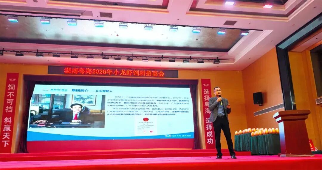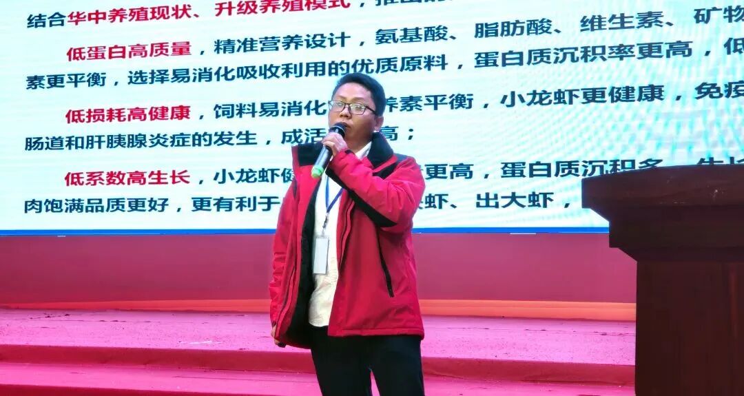 粤海生物副总经理兼技术总监胡俊博士在会上系统介绍了粤海生物在小龙虾健康养殖领域的综合解决方案。依托集团全新自营 GMP 车间和强大研发实力,粤海生物为养殖户提供安全、高效的动保产品,全面护航水产养殖绿色发展。