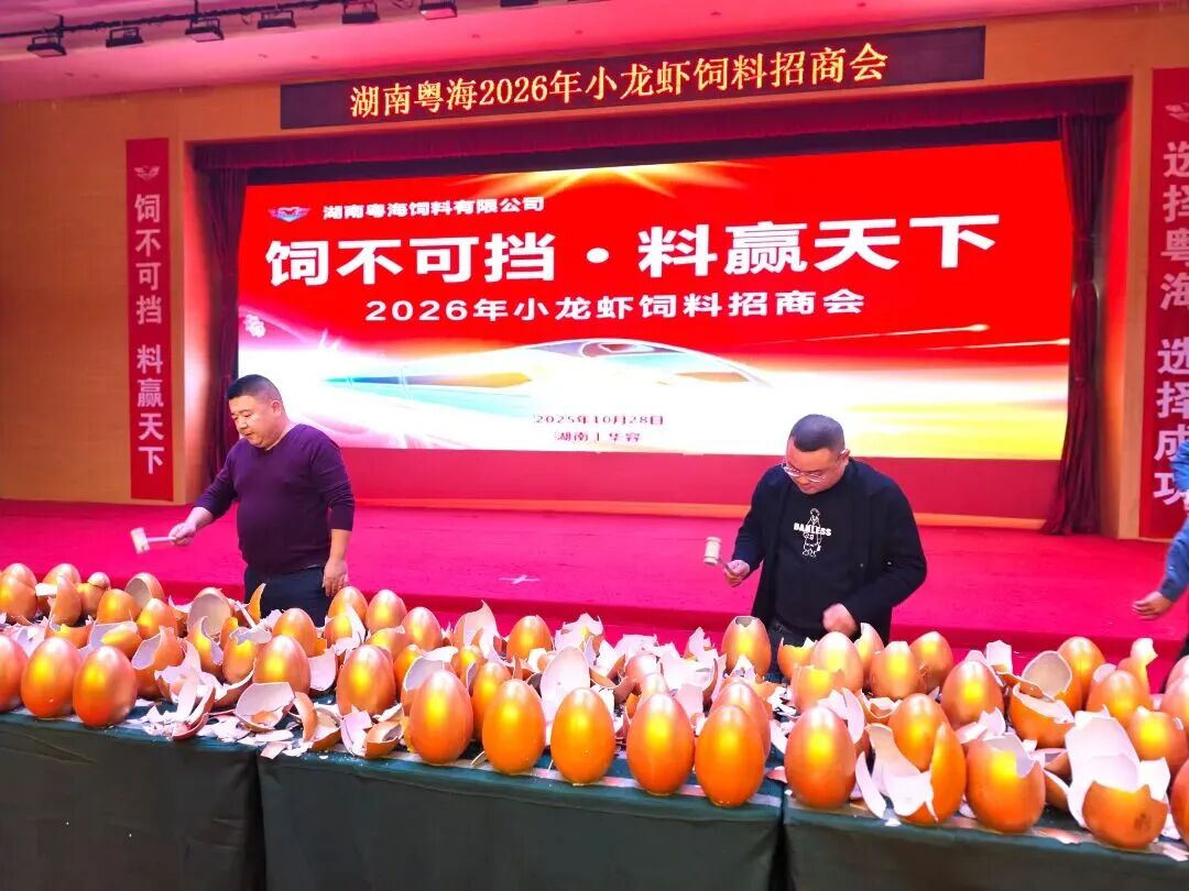 为进一步破解湖南地区小龙虾养殖亩产不高、效益不稳的行业痛点,赋能区域小龙虾产业升级,2025年10月28日,湖南粤海在华容县华冠君豪大酒店举办以“饲不可挡?料赢天下”为主题的2026年小龙虾饲料招商会,以饲料、动保、技术三方联动,分享前沿养殖方案,携手养殖户共赢2026。招商会现场,湖南、湖北两地160余位经销商代表参会,订料量突破9550吨。