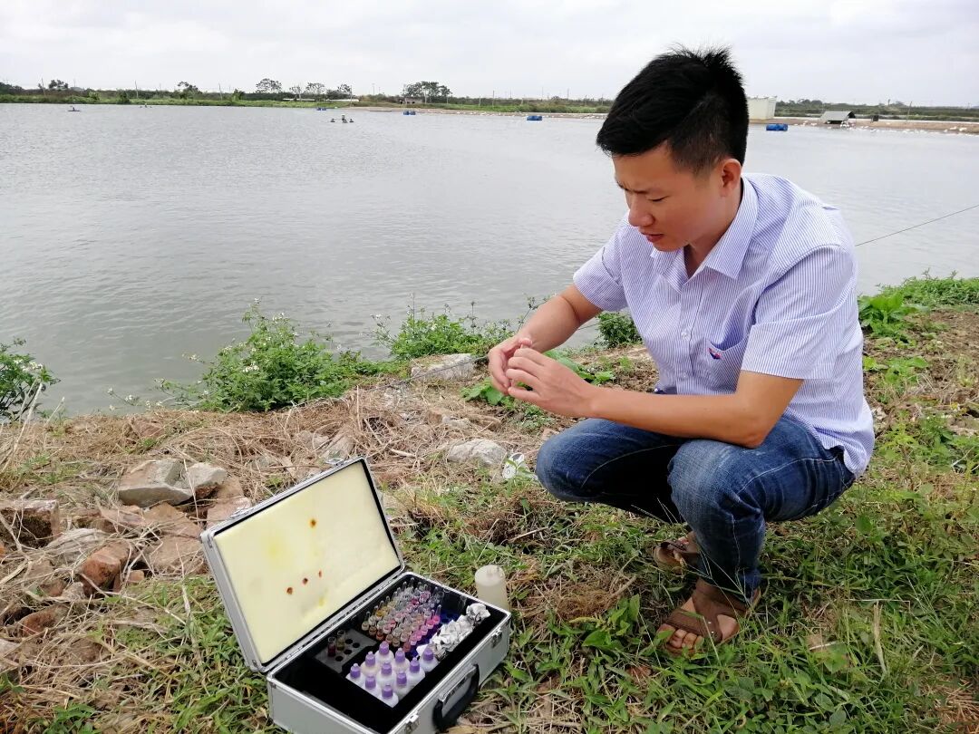 ▲欧大耀同志在塘头一线正在为农户检测水质