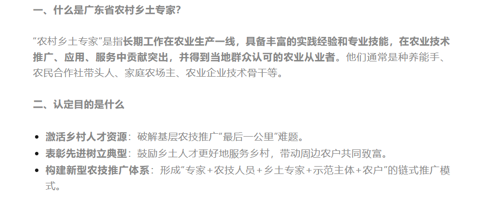 “2025年广东省农村乡土专家”认定面向农业生产经营一线,旨在挖掘应用技能突出、示范带动作用明显、群众认可的技术骨干,充实基层农业科技推广队伍,助力农业高质量发展与农民增产增收。