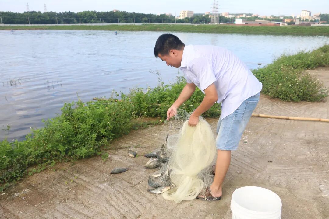 ▲欧大耀同志在塘头一线抛网打样,跟踪养殖效果、检查鱼体生长情况。