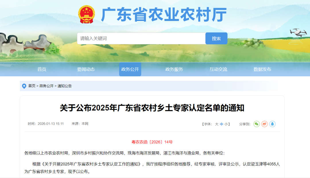 近日,广东省农业农村厅公布“2025年广东省农村乡土专家”认定名单,广东粤海饲料集团股份有限公司(股票代码:001313.SZ)谢镇伟、欧大耀两位同志成功入选。这一认定,既是对两位同志农产品营销宣传、农技推广工作的认可,也是对粤海饲料在乡村振兴、基层农技人才培育及水产养殖产业赋能方面工作的肯定。