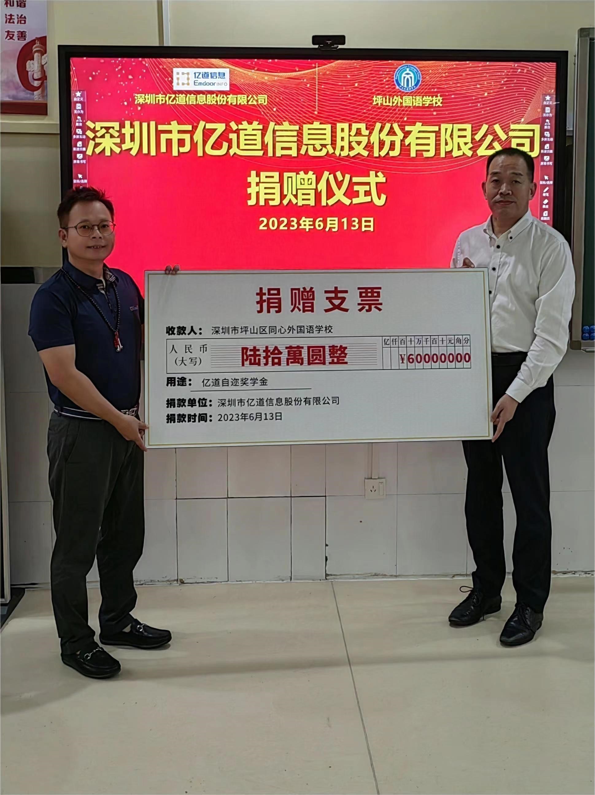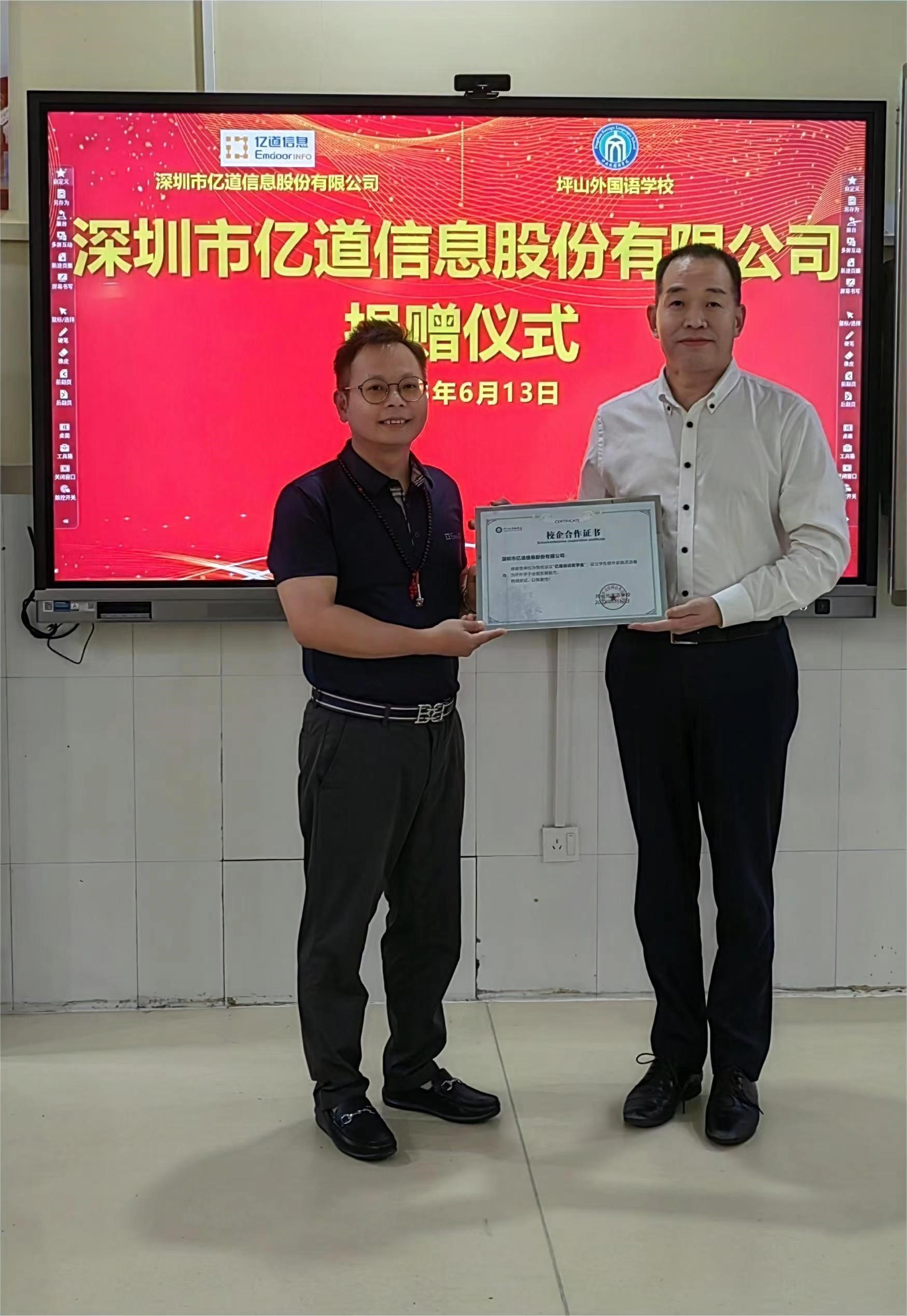 6月13日,“亿道自迩奖学金”签约仪式在深圳市坪山外国语学校圆满举行。据悉,亿道集团创始人、亿道信息董事钟景维以及坪山外国语学校校长刑向钊、副校长刘斌、副校长王恺骊等校领导出席了本次活动,双方在签约现场进行了深入交流。当天,亿道信息为坪山外国语学校献上捐赠支票,学校也为公司颁发了校企合作证书。