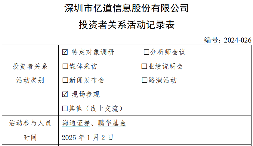 2025年1月3日,上市公司亿道信息(001314.SZ)发布了《投资者关系活动记录表》,披露公司接待了海通证券、鹏华基金的调研,公司副总经理、董事会秘书乔敏洋等管理层人士参与,并接待投资机构代表提问。