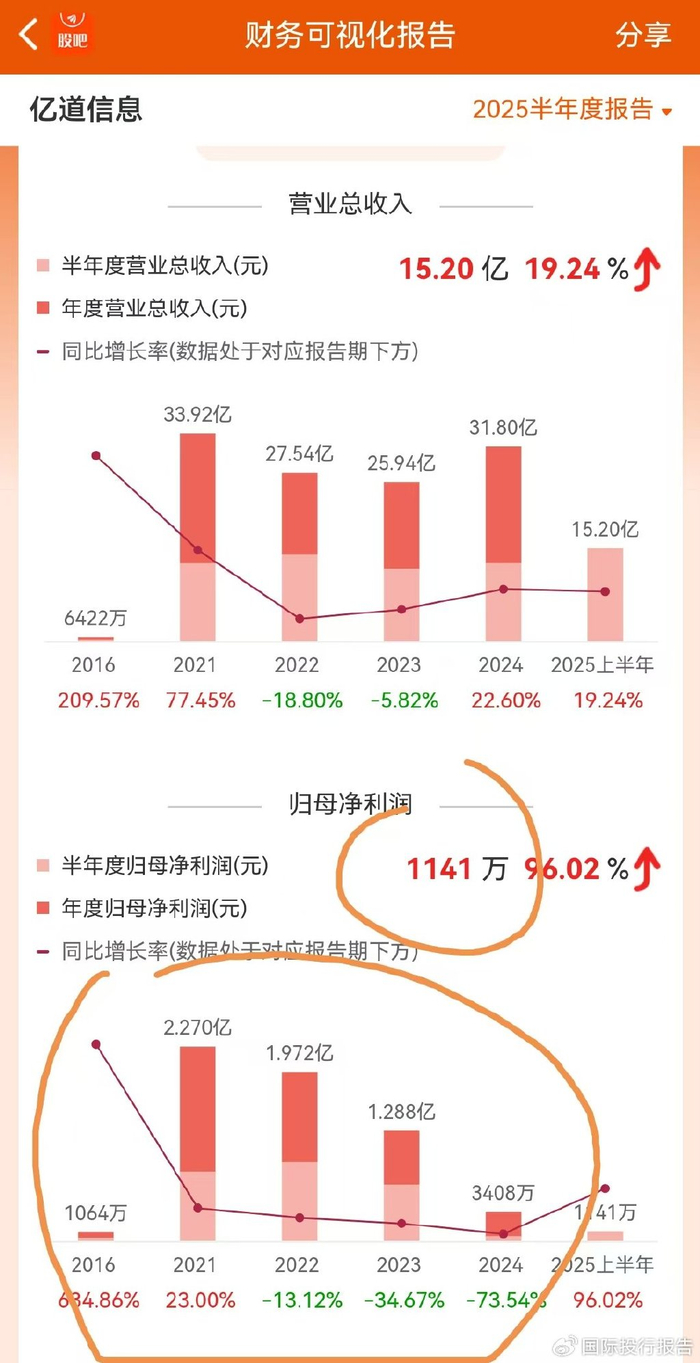 2 、亿道信息 2023 年 2 月 14 日在深交所创业板IPO挂牌上市,但IPO当年业绩下滑 34.36%,次年的 2024 年业绩再次疯狂下跌73.54%,一直到今年上半年稳住,但归母也只有 1141 万。