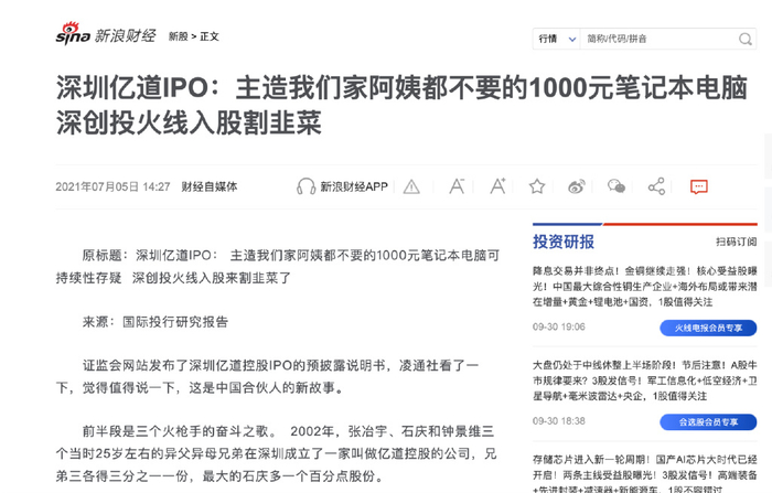 4 、早在公司 IPO 期间,凌通社就发表过“深圳亿道IPO:主造我们家阿姨都不要的1000元笔记本电脑深创投火线入股割韭菜"的研报告,指出其低端制造无法自我发展。