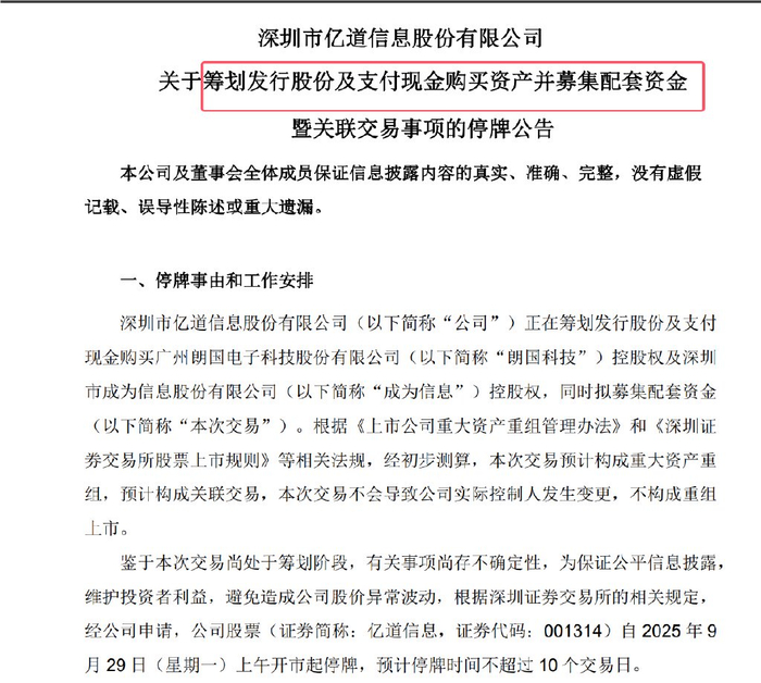 1 、停牌事由和工作安排。深圳市亿道信息股份有限公司正在筹划发行股份及支付现金购买广州朗国电子科技股份有限公司控股权及深圳市成为信息股份有限公司控股权,同时拟募集配套资金。本次交易不会导致公司实际控制人发生变更,不构成重组上市。