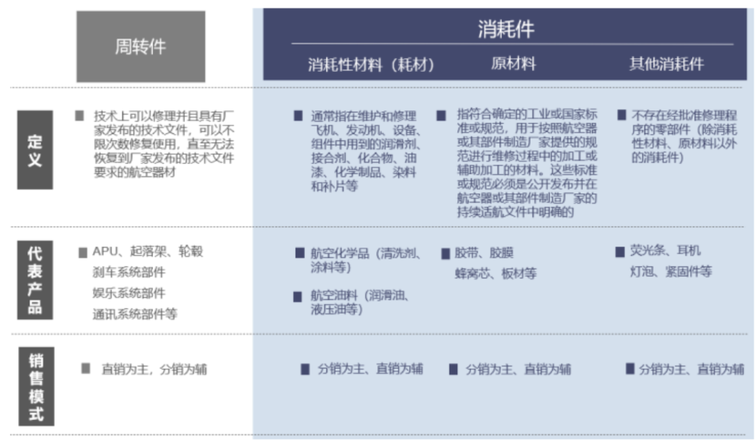 航材主要分为周转件和消耗件两类,周转件单价高、数量少、不可替代性强、技术壁垒高,通常采用原厂直销,消耗件单价相对低、可替代性强、品种繁多、管理难度大,还存在有效期、仓储和运输要求,通常采用经销模式销售。