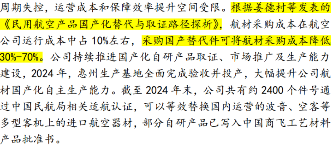润贝航科的航材可等效替换国内运营的波音、空客等多种型号客机上的进口航空器材,来自中邮证券的研报显示,采购国产替代件可将航材采购成本降低30%-70%。