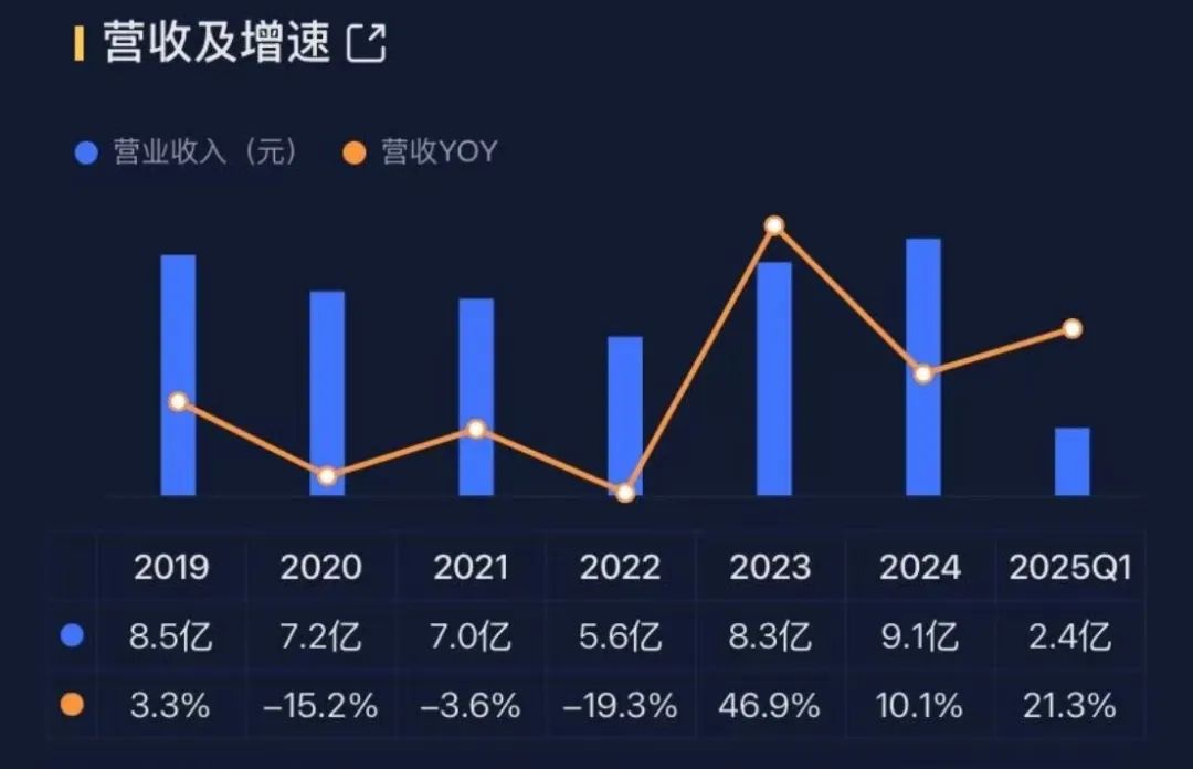 润贝航科是在2022年6月上市的,其收入在2020年至2022年连续3年下滑后,自2023年开始重拾增长,且都超过两位数。2025年一季度,润贝航科总营收2.4亿,同比增长21.3%,增长势头看上去仍在继续。