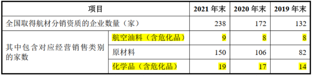 润贝航科2011年获得中国民用航空维修协会颁布的国内首批航材分销商证书。近年来,国内取得航材分销资质的企业虽然在不断增加,但在航空油料、化学品领域的公司始终维持在一个固定数量范围内,这也是公司最核心收入来源。