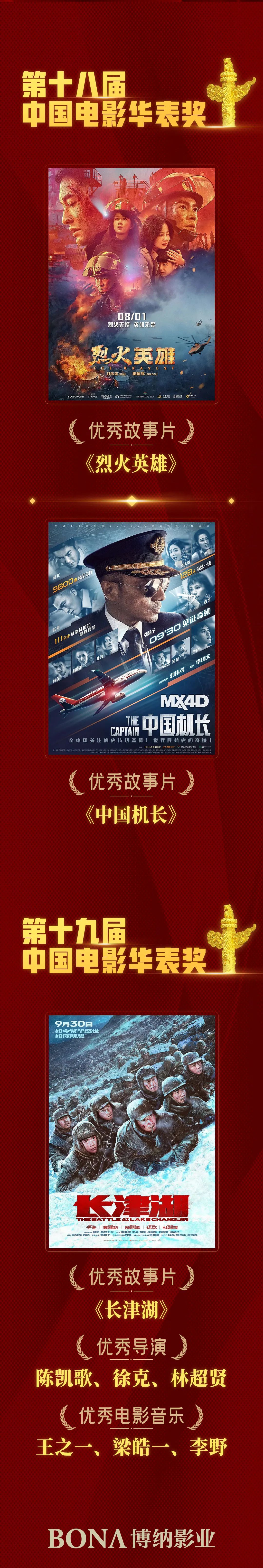 博纳影业集团荣誉出品发行的电影《中国机长》《烈火英雄》荣获第十八届中国电影华表奖优秀故事片奖!电影《长津湖》荣获第十九届中国电影华表奖优秀故事片奖、优秀导演奖、优秀电影音乐奖!