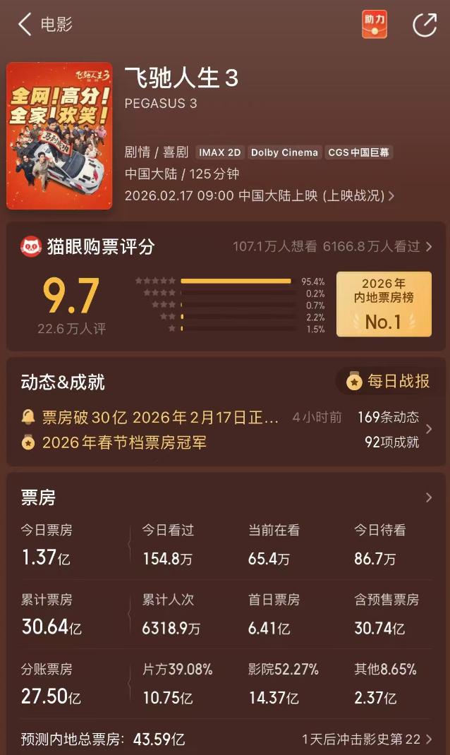 截至发稿时,《飞驰人生3》电影票房突破30亿元。猫眼数据显示,该影片票房为30.64亿元,断层领先2026年票房榜。
