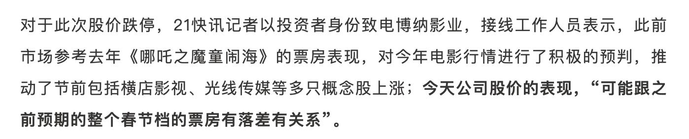 据媒体报道,博纳影业接线工作人员回应股价波动称,此前市场参考去年《哪吒之魔童闹海》的票房表现,对今年电影行情进行了积极的预判,推动了节前包括横店影视、光线传媒等多只概念股上涨;今天公司股价的表现,“可能跟之前预期的整个春节档的票房有落差有关系”。