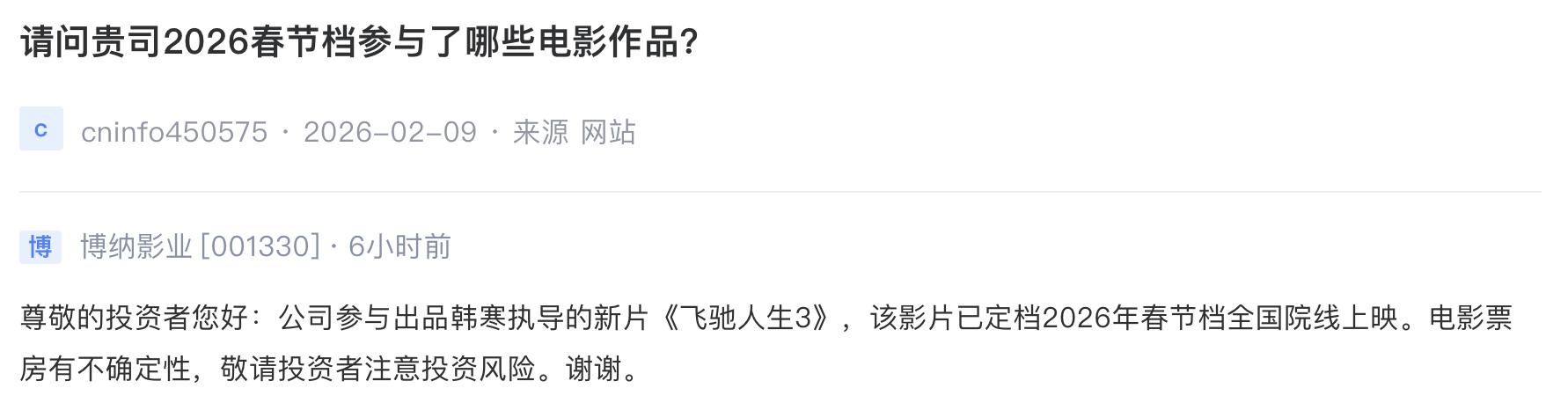消息面上,博纳影业当天在互动平台表示,公司参与出品韩寒执导的新片《飞驰人生3》,该影片已定档2026年春节档全国院线上映。电影票房有不确定性,敬请投资者注意投资风险。