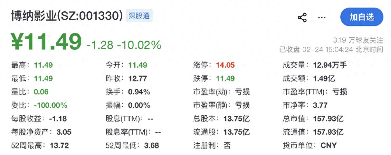 瑞财经吴文婷2月24日,博纳影业收报11.49元,跌10.02%,总市值约157.93亿元。