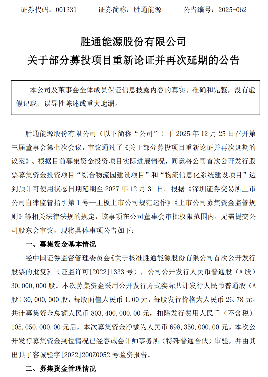 附:胜通能源:关于部分募投项目重新论证并再次延期的公告