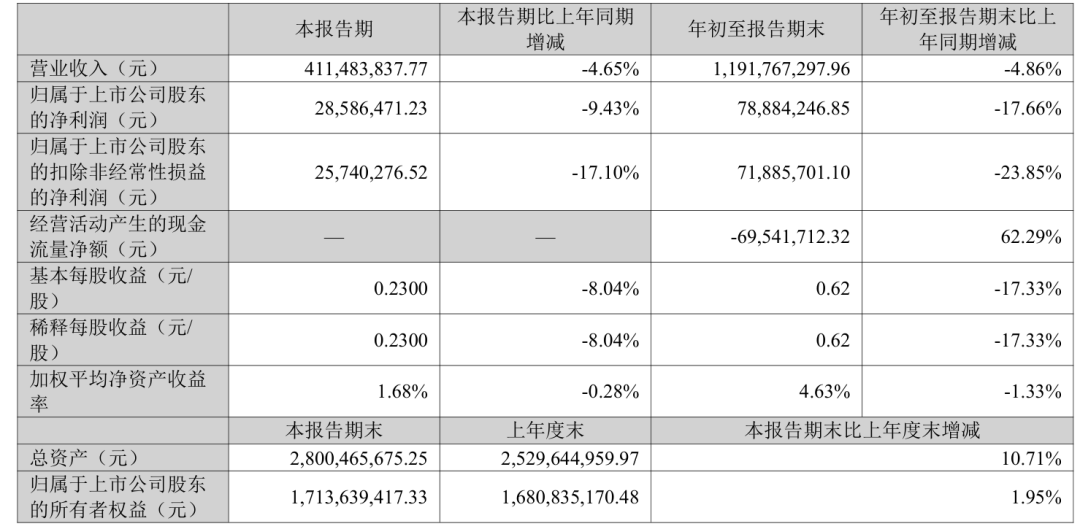 光华股份10月27日披露2025年第三季度报告。前三季度公司实现营业总收入11.92亿元,同比下降4.86%;归母净利润7888.42万元,同比下降17.66%;扣非净利润7188.57万元,同比下降23.85%。