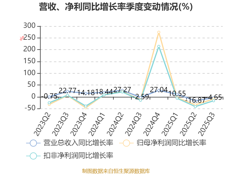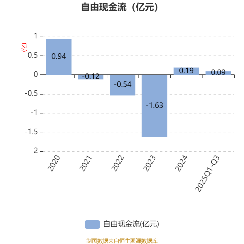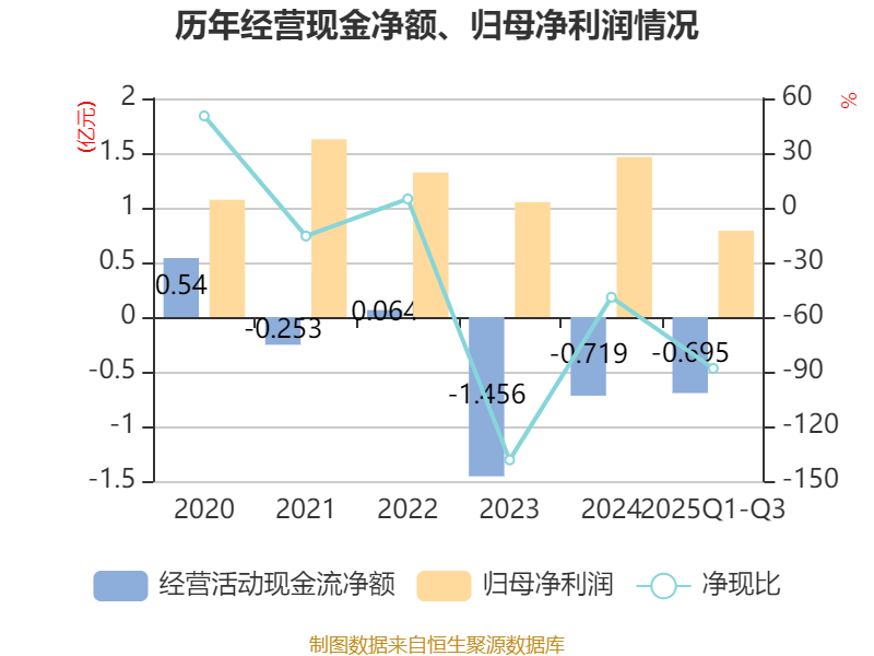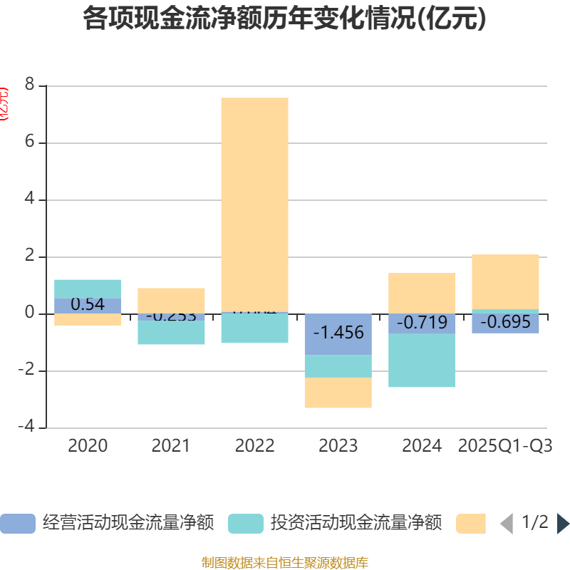2025年前三季度,公司经营活动现金流净额为-6954.17万元,同比增加1.15亿元;筹资活动现金流净额1.92亿元,同比减少1183.41万元;投资活动现金流净额1490.23万元,上年同期为-9295.59万元。