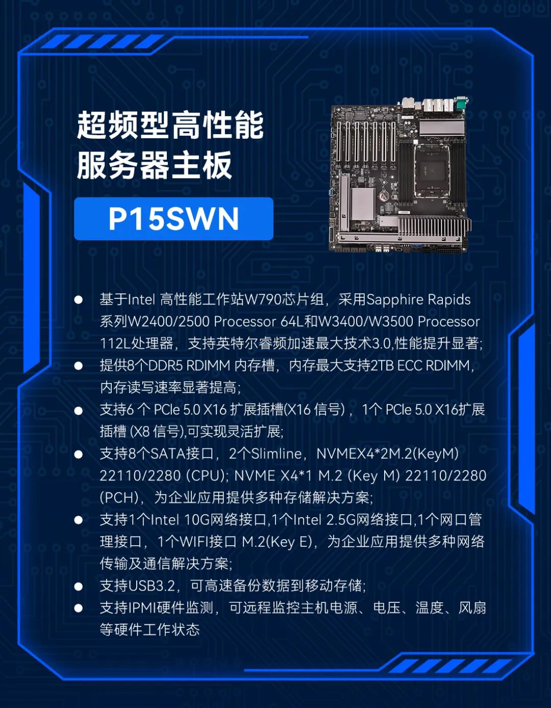 P15SWN是智微为高频交易、高端游戏开发、复杂工程模拟等场景量身打造的一款超频型高性能服务器主板,最高可支持7张显卡扩展。其中有高达6个PCIE 5.0(X16)扩展插槽,可用于大功率显卡。这款主板具备CPU超频能力,能够全面释放新一代Intel Xeon处理器的强大潜能,目前最高支持60核,超频到4.8Ghz,为用户提供超强计算能力。例如针对金融行业用户,这个系列的主板可以支持其定制化的风险管理系统、高频交易平台和大数据分析平台,为其提供高精度、低延迟的交易处理和风险管理能力。