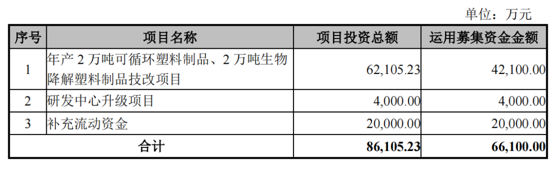公司本次发行所募集资金主要投资年产2万吨可循环塑料制品、2万吨生物降解塑料制品技改项目、研发中心升级项目以及补充流动资金。