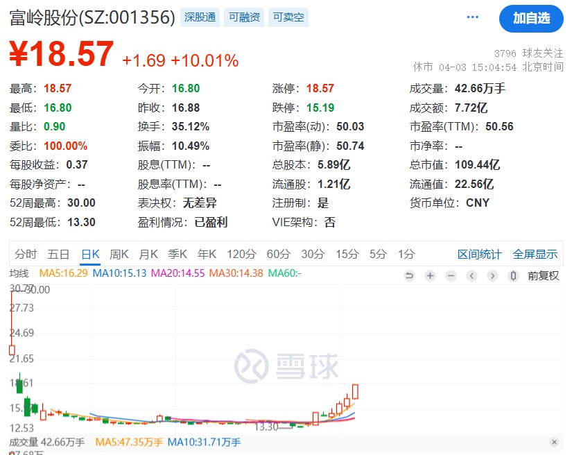 截至4月3日收盘,富岭股份拉升涨停,报18.57元/股,总市值为109.44亿元。