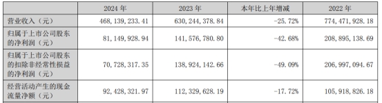 兴欣新材(001358.SZ)昨晚披露的2024年年度报告显示,2024年,公司营业收入为4.68亿元,同比下降25.72%;归属于上市公司股东的净利润为8114.99万元,同比下降42.68%;归属于上市公司股东的扣除非经常性损益的净利润为7072.83万元,同比下降49.09%;经营活动产生的现金流量净额为9242.83万元,同比下降17.72%。