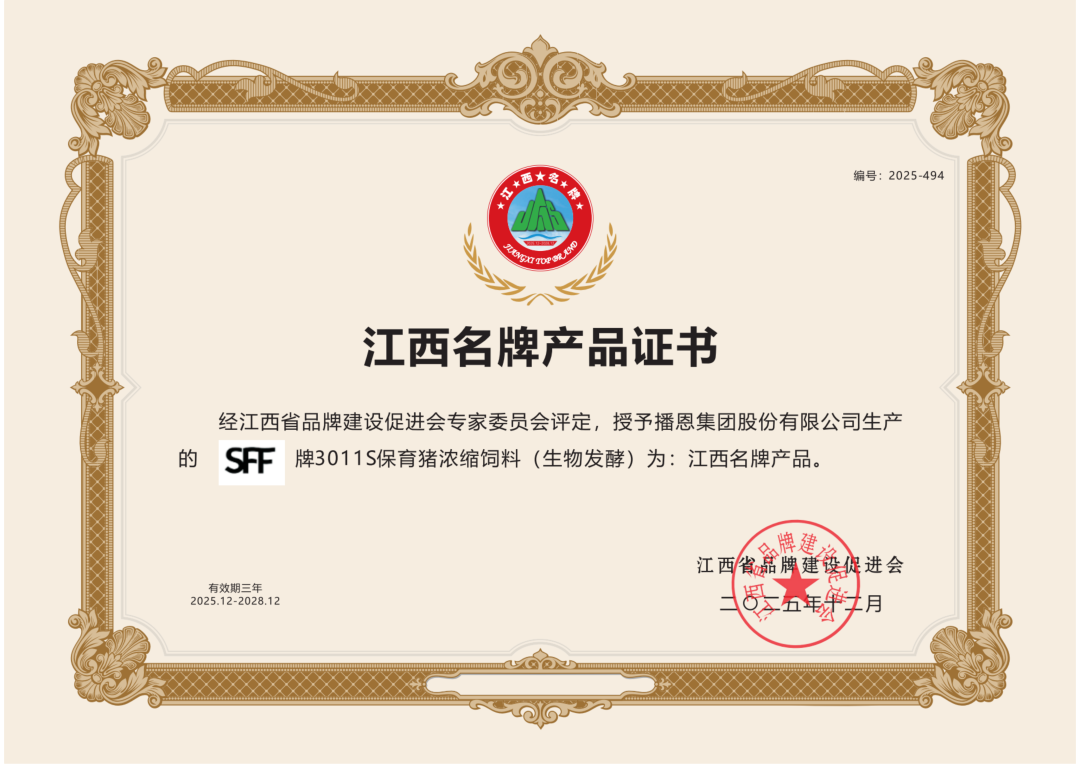 在此次发布会中,播恩集团迎来了又一高光时刻,旗下的两款明星产品——3011S 保育猪浓缩饲料(生物发酵)和播恩一条鞭小猪配合饲料(生物发酵),凭借良好口碑与过硬的产品实力,在众多参评产品中脱颖而出,获评两项省级产品荣誉。这一殊荣不仅是对播恩集团产品品质的高度认可,更是对其多年来坚持创新驱动、品质至上的有力见证,标志着播恩集团在农业品牌建设的道路上迈出了坚实而重要的一步。