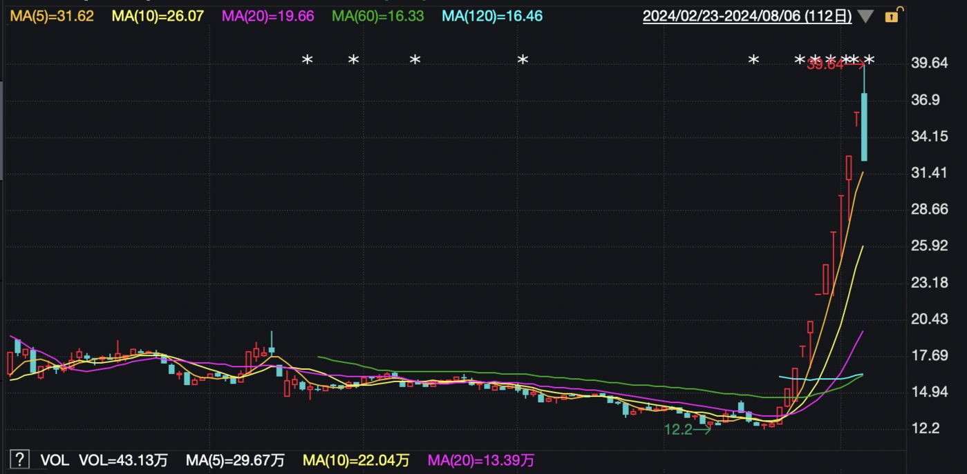 8月6日,此前走出11连板的“大牛股”腾达科技(001379.SZ)上演罕见“地天地”行情,开盘后闪崩至跌停,临近上午10时又快速拉升触及涨停,盘中录得12连板,然而尾盘再度跌停。截至收盘,腾达科技报32.44元,跌9.99%,日内换手率86.25%。