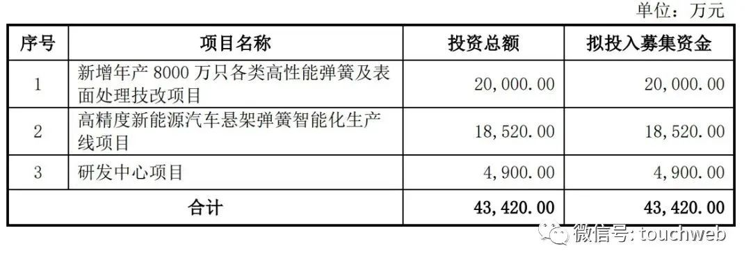 华纬科技原计划募资4.34亿元,其中,2亿元用于新增年产8000万只各类高性能弹簧及表面处理技改项目,1.85亿元用于高精度新能源汽车悬架弹簧智能化生产线项目,4900万元用于研发中心项目。