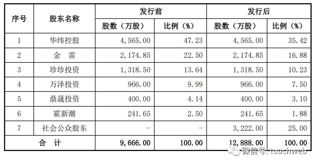 IPO前,华纬控股持股为47.23%,珍珍投资持股为13.64%,万泽投资持股为9.99%,鼎晟投资持股为4.14%,霍新潮持股为2.5%。