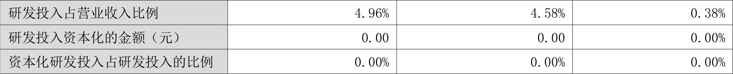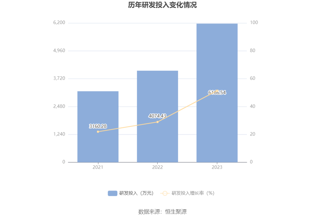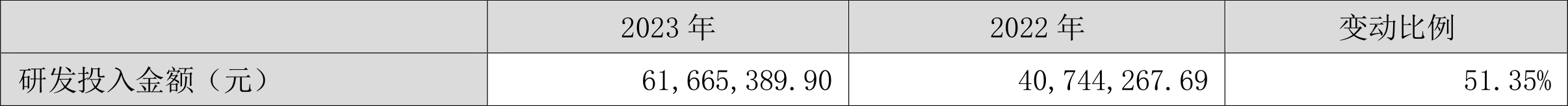 2023年全年,公司研发投入金额为6166.54万元,同比增长51.35%;研发投入占营业收入比例为4.96%,相比上年同期上升0.38个百分点。此外,公司全年研发投入资本化率为0。