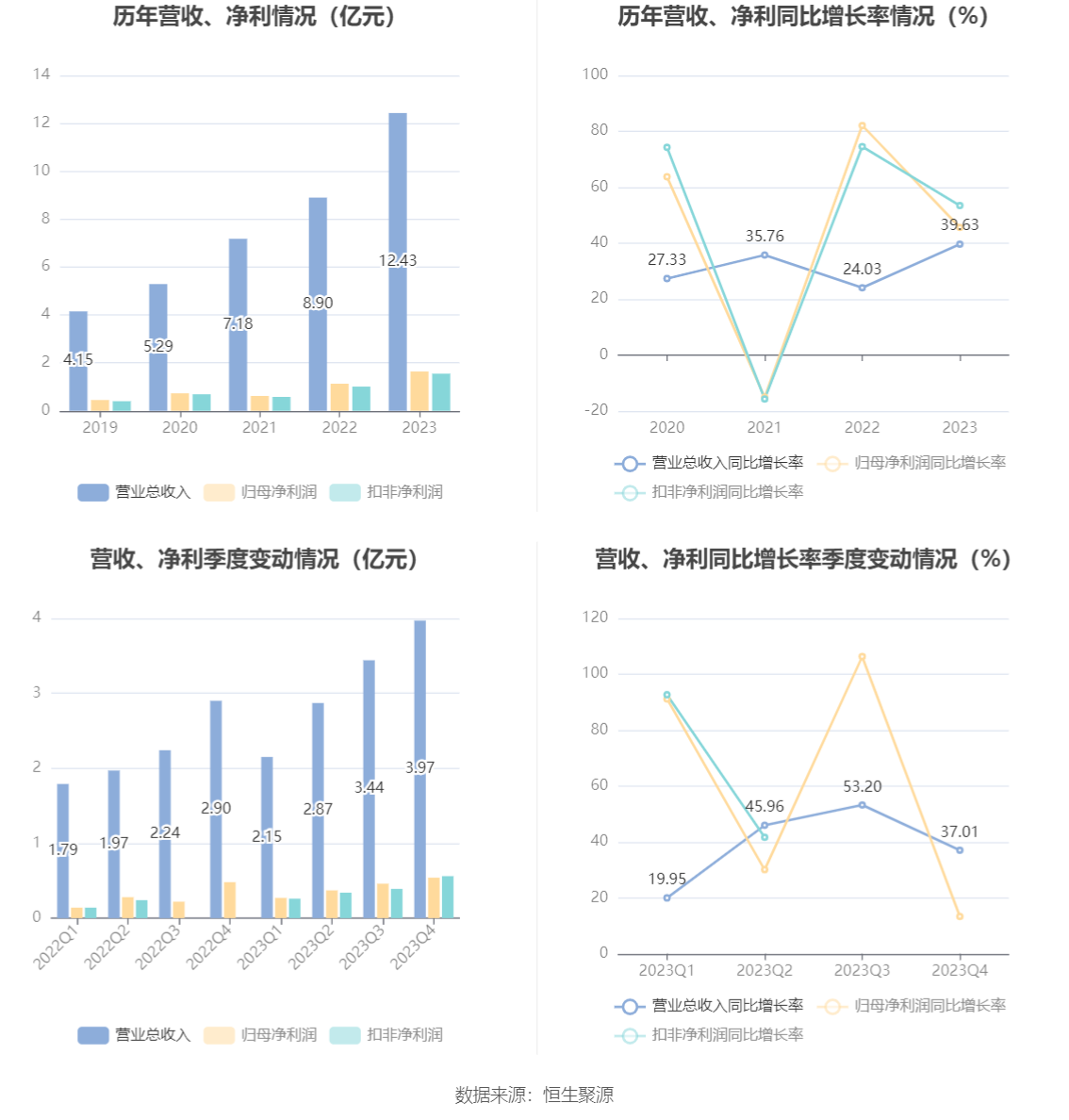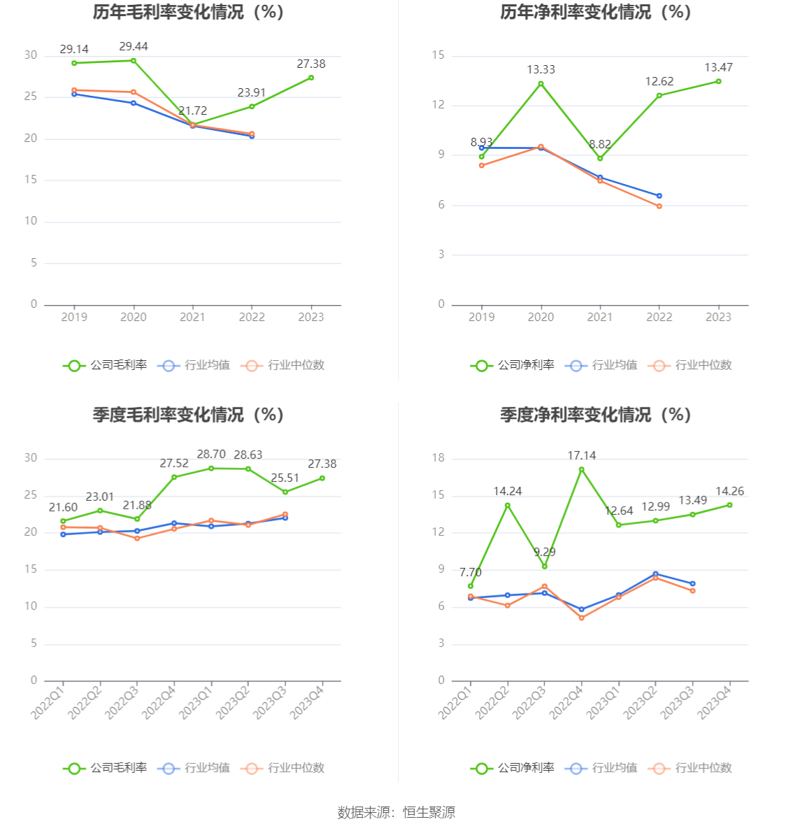 2023年,公司毛利率为27.38%,同比上升3.47个百分点;净利率为13.47%,较上年同期上升0.85个百分点。从单季度指标来看,2023年第四季度公司毛利率为27.38%,同比下降0.14个百分点,环比上升1.87个百分点;净利率为14.26%,较上年同期下降2.88个百分点,较上一季度上升0.77个百分点