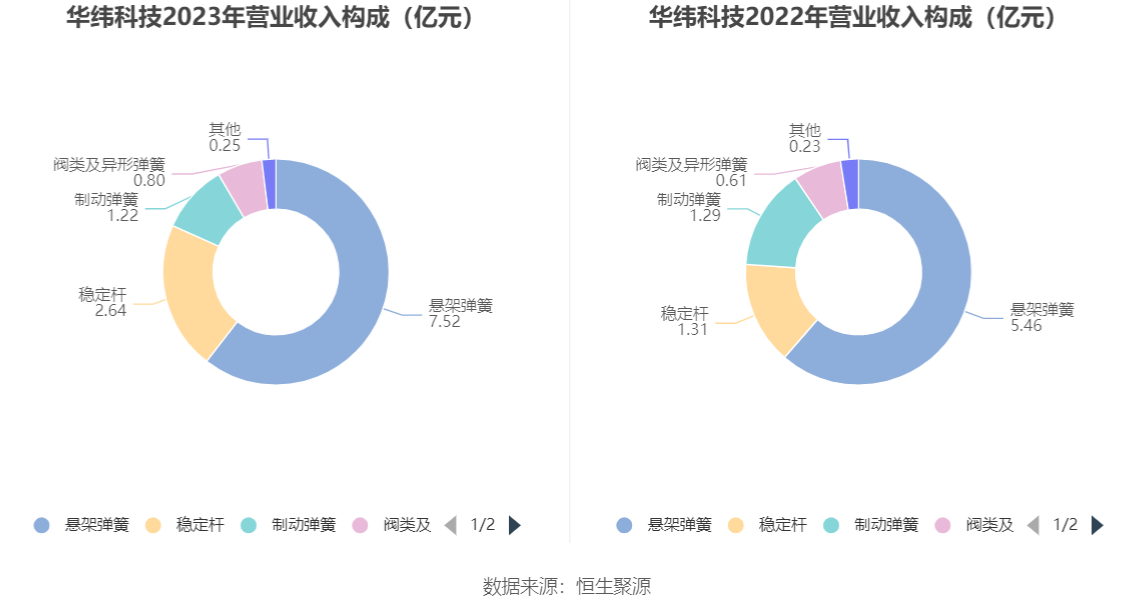 分产品来看,2023年公司主营业务中,悬架弹簧收入7.52亿元,同比增长37.82%,占营业收入的60.50%;稳定杆收入2.64亿元,同比增长101.28%,占营业收入的21.26%;制动弹簧收入1.22亿元,同比下降5.59%,占营业收入的9.81%。
