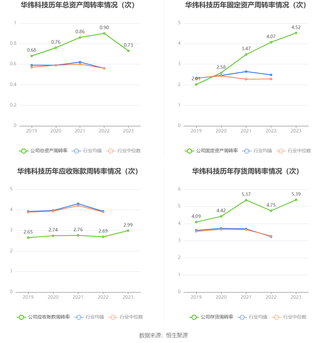 营运能力方面,2023年,公司公司总资产周转率为0.73次,上年同期为0.90次(2022年行业平均值为0.56次,公司位居同行业6/98);固定资产周转率为4.52次,上年同期为4.07次(2022年行业平均值为2.48次,公司位居同行业22/98);公司应收账款周转率、存货周转率分别为2.99次、5.39次。