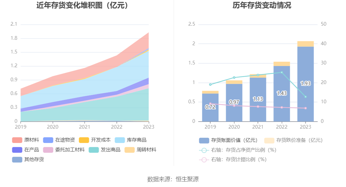 从存货变动来看,截至2023年年末,公司存货账面价值为1.93亿元,占净资产的12.74%,较上年末增加5006.56万元。其中,存货跌价准备为1425.37万元,计提比例为6.89%。