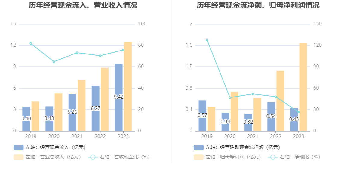 2023年,公司营业收入现金比为75.81%,净现比为26.51%。