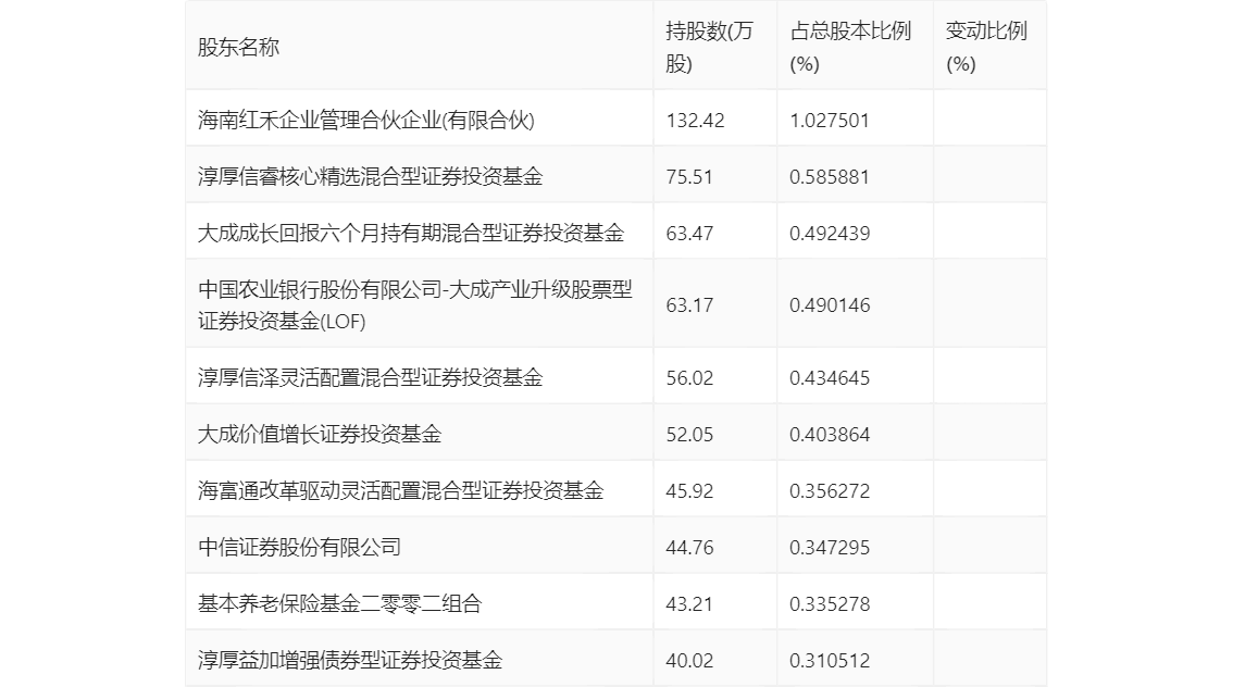 年报显示,2023年年末公司十大流通股东中,新进股东为海南红禾企业管理合伙企业(有限合伙)、海富通改革驱动灵活配置混合型证券投资基金、淳厚益加增强债券型证券投资基金,取代了三季度末的中信证券股份有限公司、MORGAN STANLEY & CO. INTERNATIONAL PLC.、中国国际金融股份有限公司、中国国际金融香港资产管理有限公司-CICCFT4(QFII)、UBS AG。在具体持股比例上,淳厚信泽灵活配置混合型证券投资基金持股有所上升,淳厚信睿核心精选混合型证券投资基金、大成成长回报六个月持有期混合型证券投资基金、中国农业银行股份有限公司-大成产业升级股票型证券投资基金(LOF)持股有所下降。