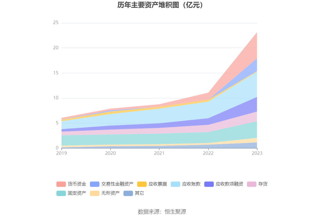 资产重大变化方面,截至2023年年末,公司交易性金融资产较上年末增加36579.73%,占公司总资产比重上升11.01个百分点;货币资金较上年末增加269.97%,占公司总资产比重上升9.78个百分点;应收账款较上年末增加51.60%,占公司总资产比重下降8.21个百分点;固定资产较上年末增加51.65%,占公司总资产比重下降5.43个百分点。