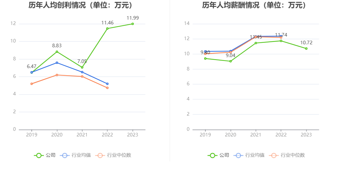 截至2023年末,公司员工总数为1368人,人均创收90.87万元,人均创利11.99万元,人均薪酬10.72万元,较上年同期分别变化0.34%、4.62%、-8.73%。