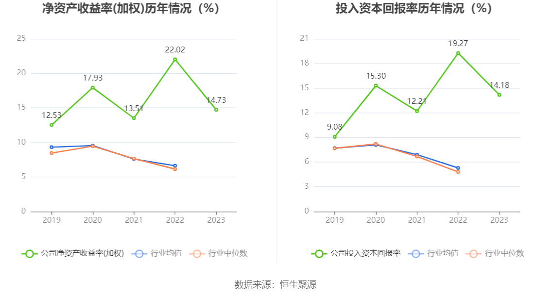 数据显示,2023年公司加权平均净资产收益率为14.73%,较上年同期下降7.29个百分点;公司2023年投入资本回报率为14.18%,较上年同期下降5.09个百分点。